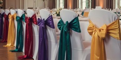 At Voilà!, we offer both luxury hire services and full event design We also supply chair sashes in virtually every colour you can imagine, from timeless ivory and champagne to bold jewel tones and modern neutrals allowing you to perfectly match your wedding palette or event theme.